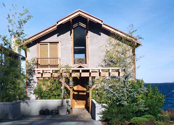 This Northwest style residence was designed for a narrow lot on Alki Beach in West Seattle. Woodwork emphasizes the beachfront character and frames the water view. The foot bridge entry captures the casual appeal of the neighborhood.